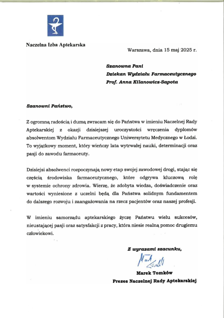 Prezes Okręgowej Rady Aptekarskiej mgr farm. Łukasz Konka odczytał list gratulacyjny skierowany do Absolwentów od Prezesa Naczelnej Rady Aptekarskiej mgra farm. Marka Tomków.