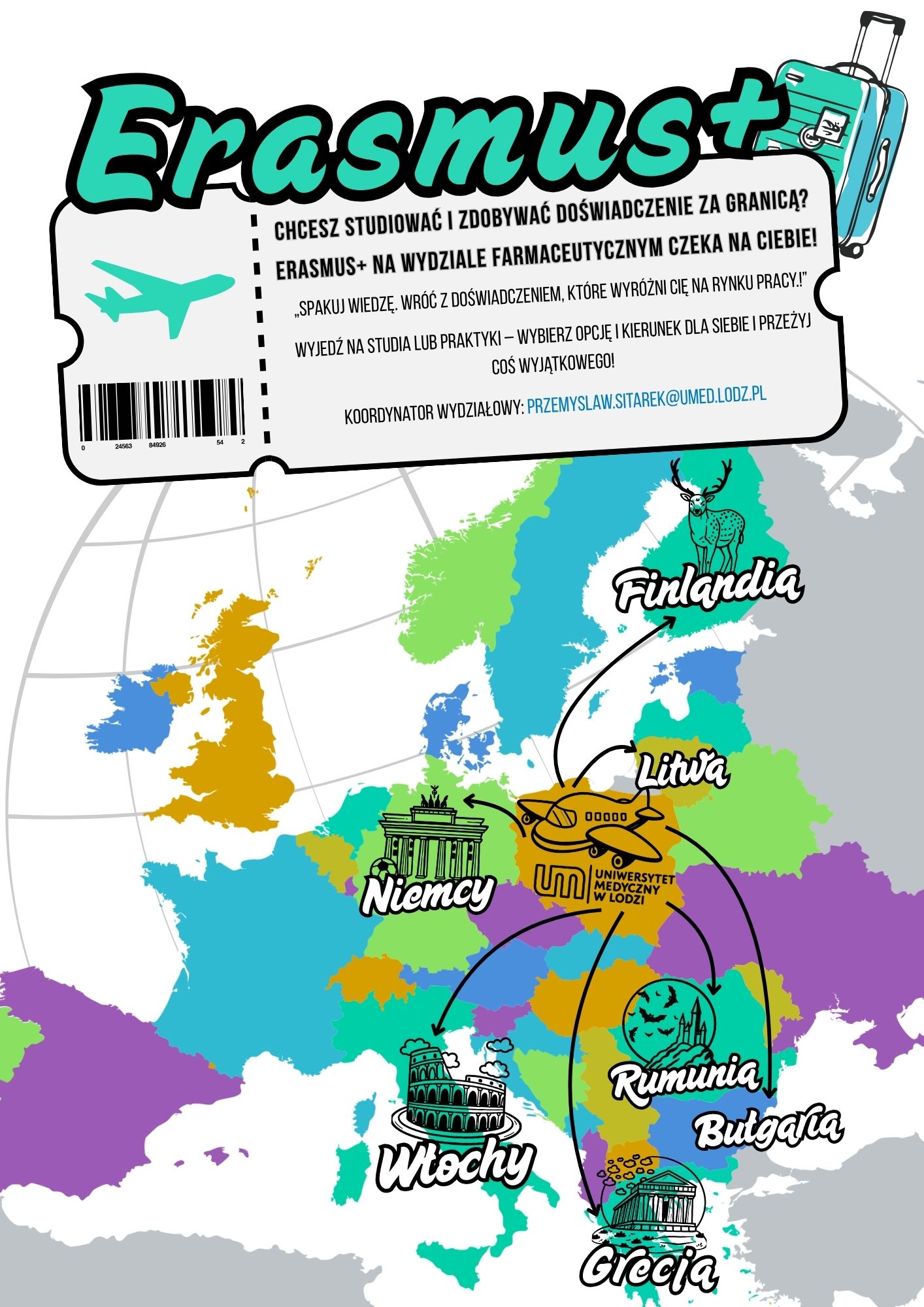 Studenci Wydziału Farmaceutycznego Uniwersytetu Medycznego w Łodzi mogą skorzystać z możliwości wyjazdu zagranicznego w ramach programu Erasmus+, realizując część studiów lub praktyki zawodowe w zagranicznych instytucjach partnerskich.