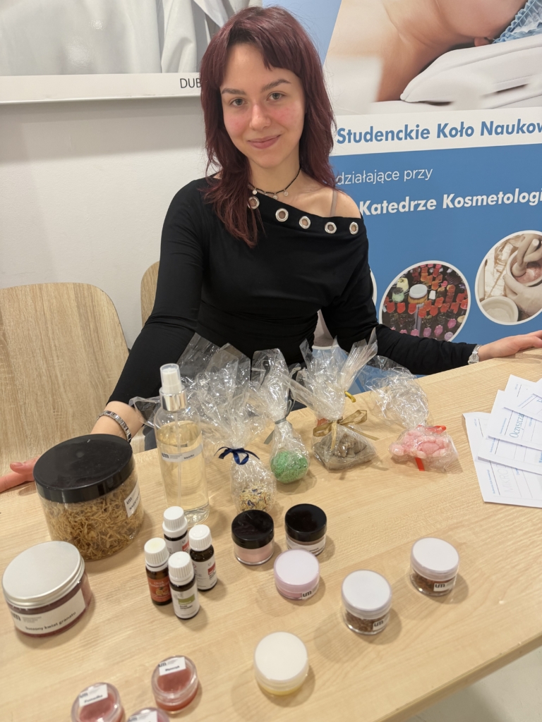 Odwiedzający mogli również skorzystać z konsultacji kosmetologicznych, uzyskując informacje dotyczące pielęgnacji skóry oraz doboru odpowiednich preparatów kosmetycznych. Na stoisku zaprezentowano także kosmetyki tworzone przez studentki w ramach zajęć dydaktycznych, co stanowiło okazję do przedstawienia praktycznego wymiaru kształcenia na kierunku Kosmetologia.