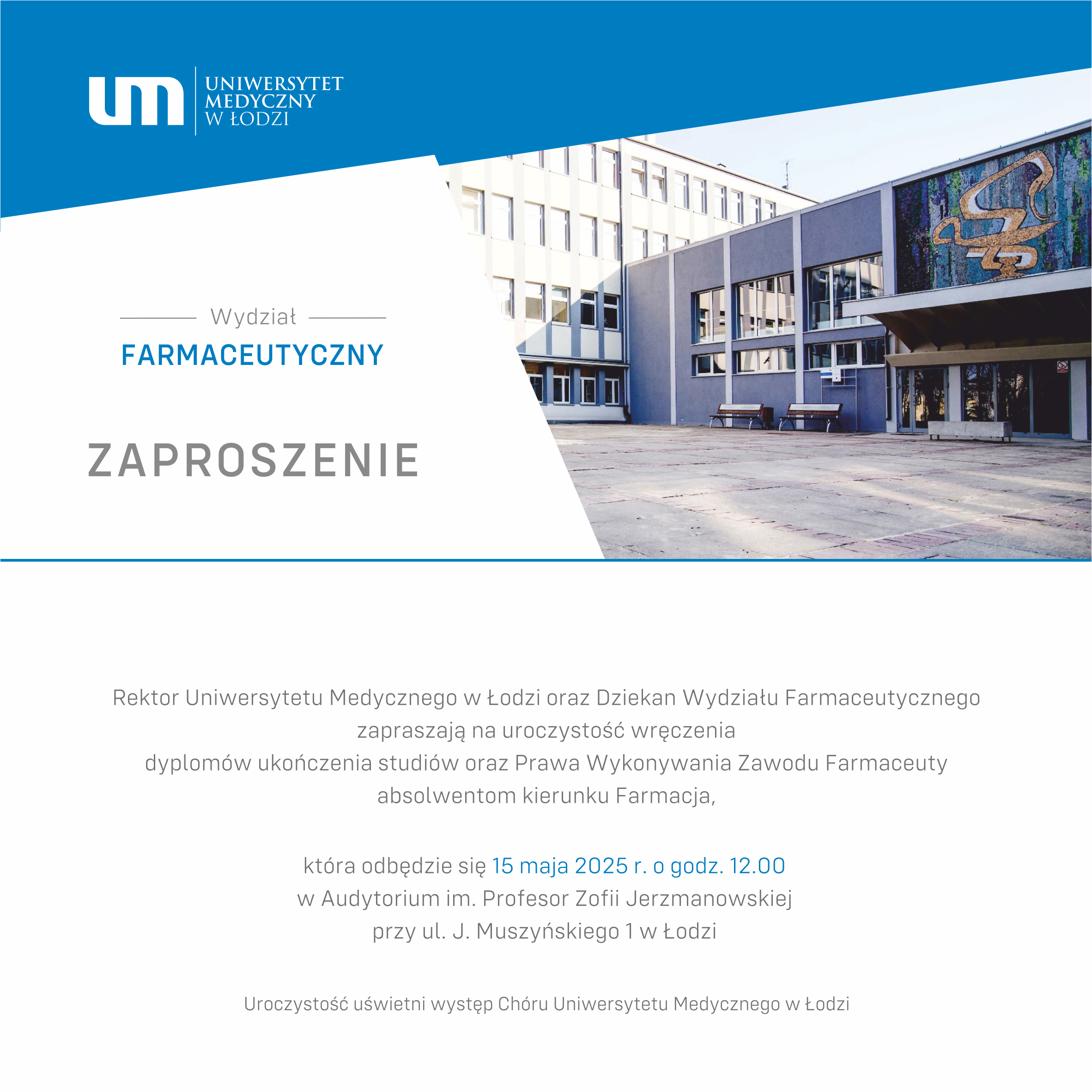 Zaproszenie na uroczystość wręczenia dyplomu ukończenia studiów oraz Prawa Wykonywania Zawodu Farmaceuty Opublikowano 5 maj 2025 Przez Dziekanat Farmacja w Aktualności